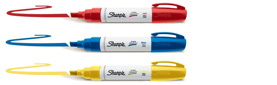 - Includes: Black, Red, White, Yellow and Blue Sharpie paint pens. Before use: Face tip upright, push against finger. Recap and shake. Press tip on surface several times